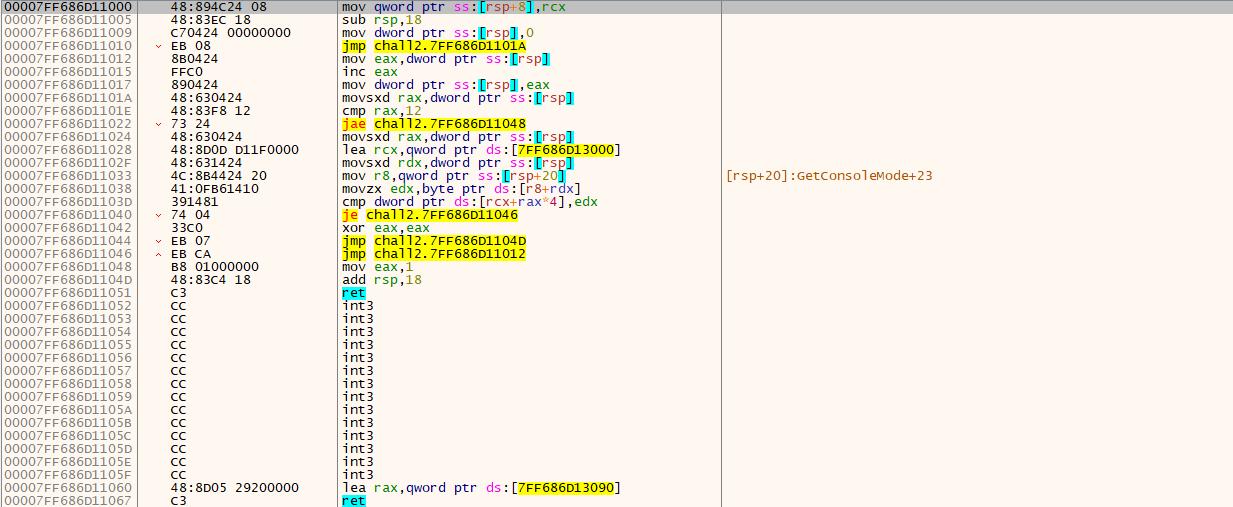 [00007FF7C48E1000] 주소의 모습이다. cmp 명령어를 통해 문자열을 비교한 뒤, 문자열을 검증하는 것을 볼 수 있다.