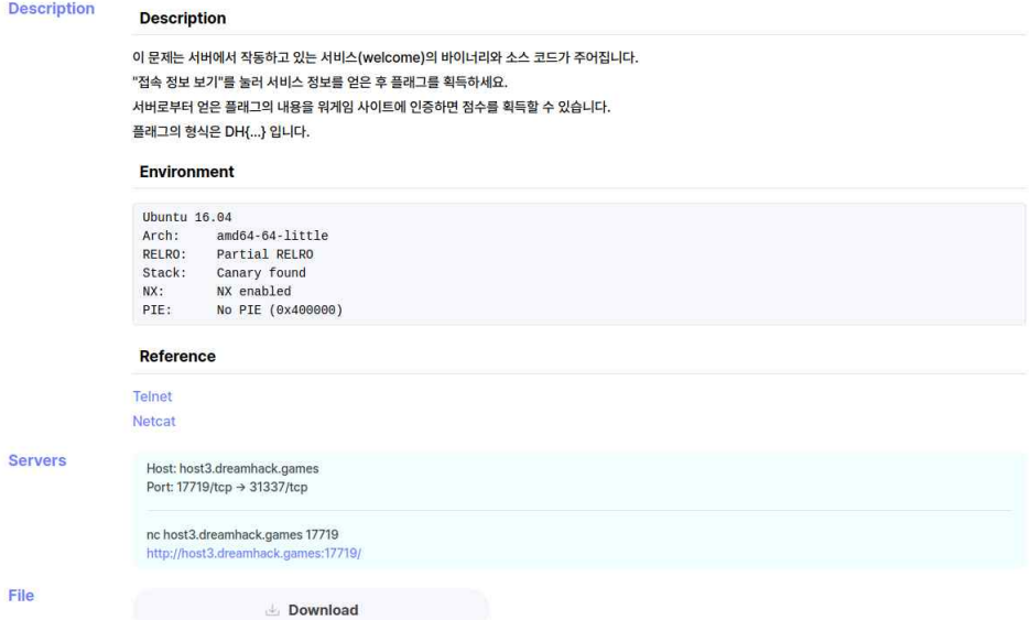 문제 정보를 읽어보면 ‘접속 정보 보기’를 눌러 서비스 정보를 가지고 서버에 접속하여 플래 그를 획득하는 것임으로 알 수 있다.