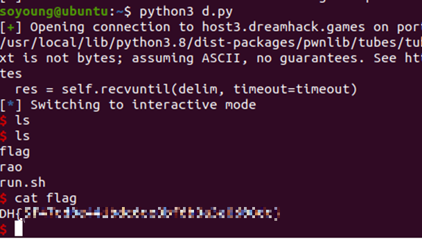 페이로드를 덮어씌우는 코드를 작성해 실행하면 flag값을 획득할 수 있다.