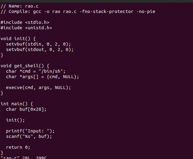 입력을 받는 buf 버퍼의 크기가 0x28로, 이 이상 입력시 에러가 발생한다.