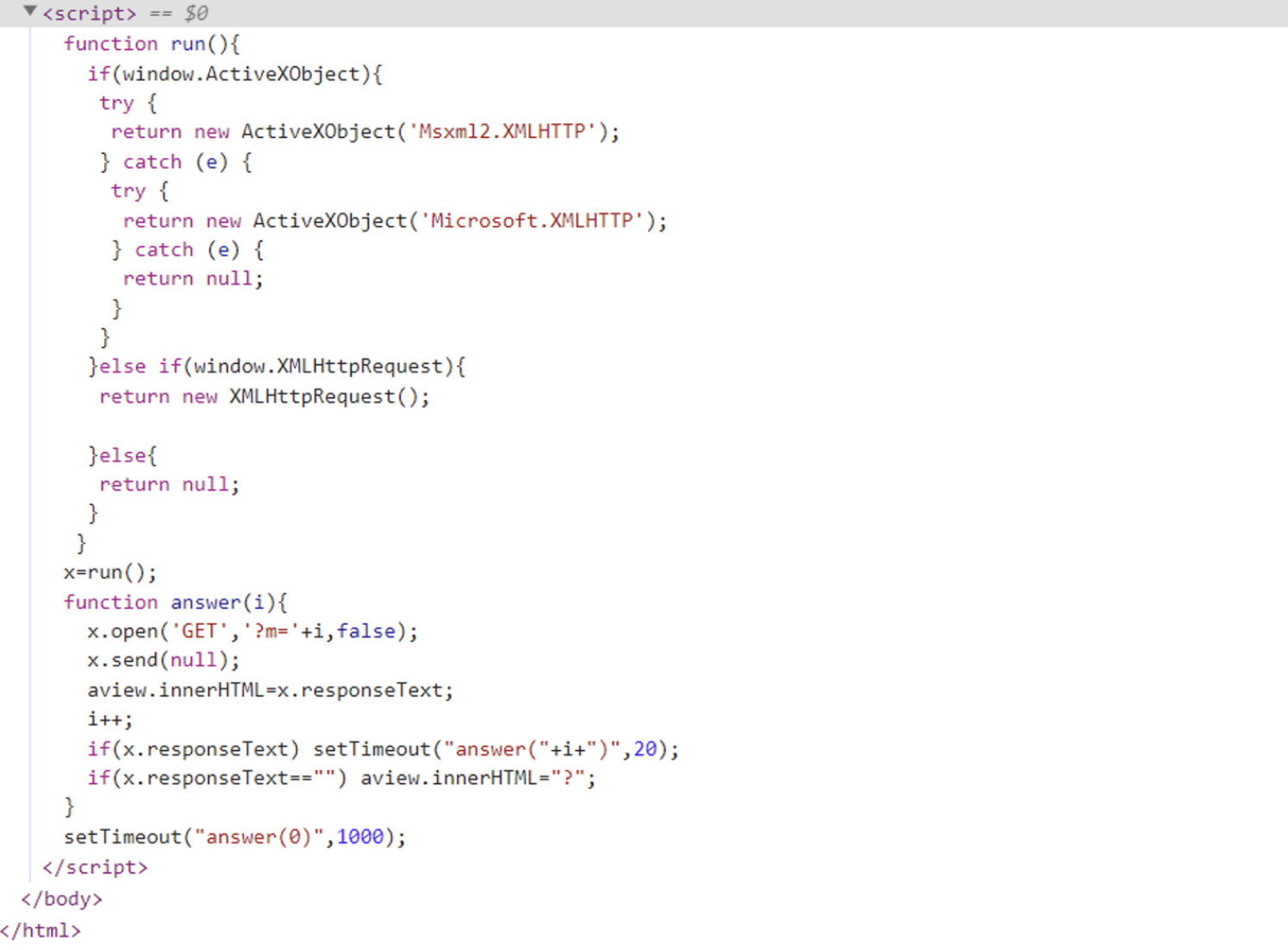 - **x.open()**을 사용하여 GET 요청을 생성하고, **x.send()**로 요청을 보냅니다. 일정 시간 후에 다시 answer() 함수를 호출하면서 서버로부터 응답이 오면 계속해서 화면에 표시한다.