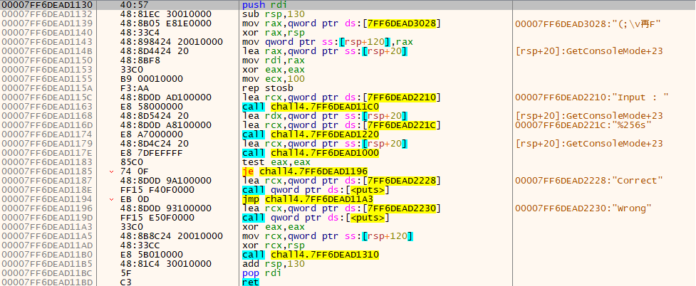 즉, [chall4.7FF6DEAD1130] 주소에 “Correct”와 “Wrong” 문자열 또한 같이 존재할 것이다.
