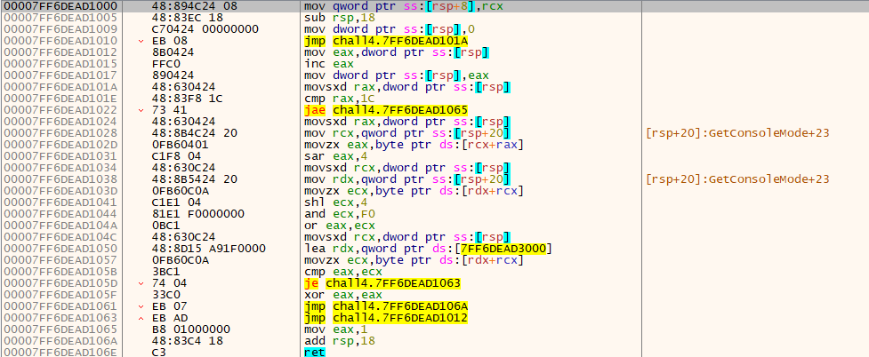 28(16진수 1C =10진수 28)번 반복하며 시프트 연산, and 연산, or 연산이 이루어지는 것을 확인할 수 있다. 그다음, [7FF6DEAD3000]주소의 값을 ecx에 저장해 eax와 비교하는 것을 알 수 있다.