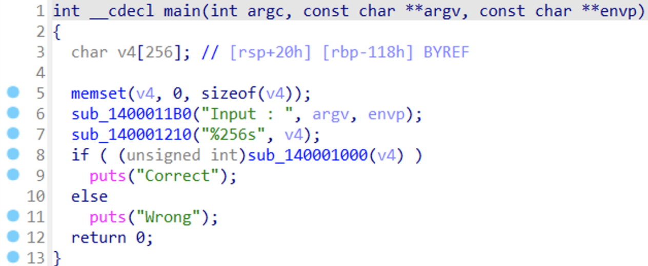x64dbg에서 알아본 연산을 자세히 확인하기 위해 IDA를 사용한다. [sub_140001000(v4)]에 문자열을 처리하는 반복문이 있을 것이다.