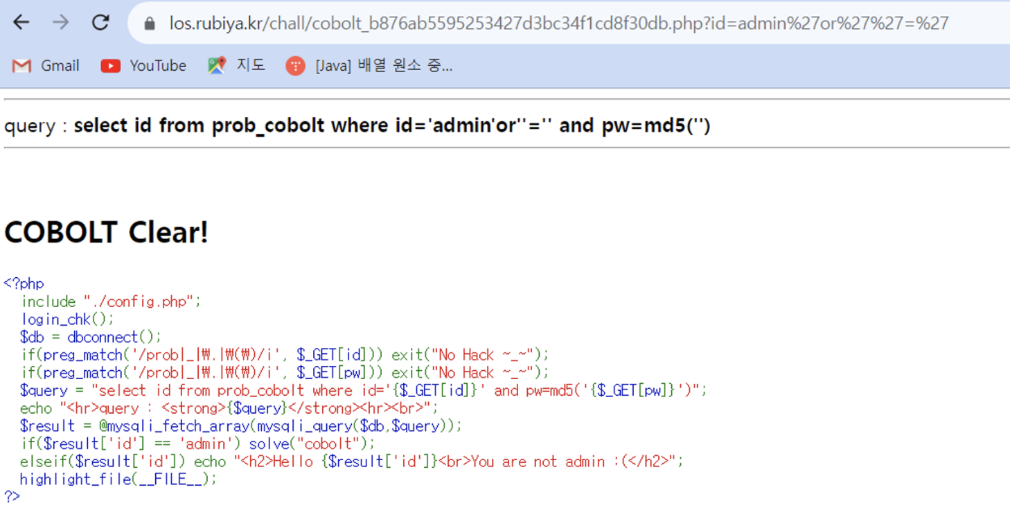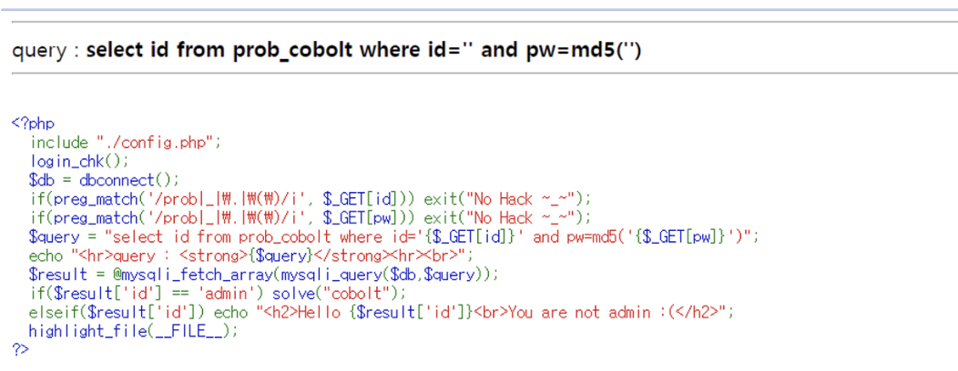 - $query = "select id from prob_cobolt where id='{$_GET[id]}' and pw=md5('{$_GET[pw]}')";