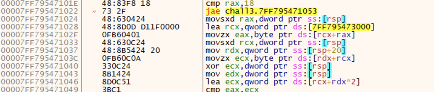 - rcx에 [7FF795473000] 주소에 저장된 값을 저장한 뒤, rax와 더한 값을 eax에 저장한다. (이때, rax는 문자열에 접근하기 위한 인덱스 값이다.)