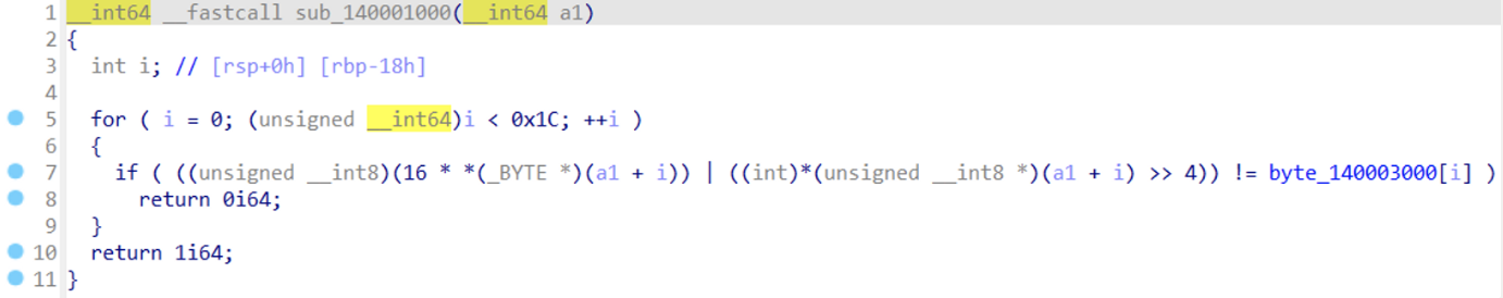 이때, if문에서 ((unsigned __int8)(16 * *(_BYTE )(a1 + i)) | ((int)(unsigned __int8 *)(a1 + i) >> 4)) != byte_140003000[i] 연산이 진행되는 것을 확인할 수 있다. 이를 정리하면 아래와 같다.