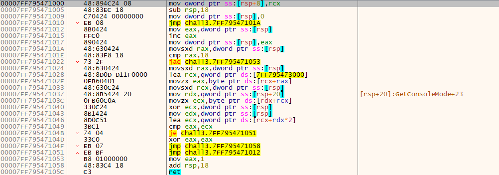 [00007FF795471000] 주소의 모습이다. 문자열을 비교하는 반복문이 존재하므로 이를 자세히 확인한다.