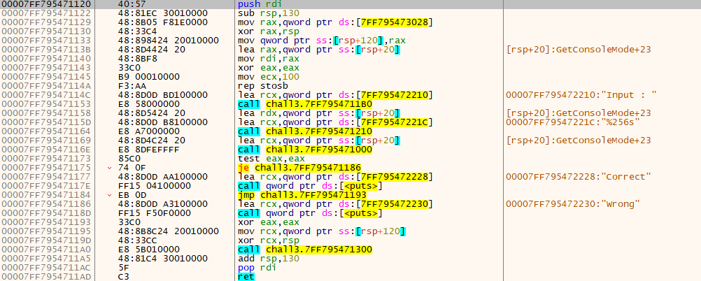 즉, [chall3.7FF795471120] 주소에 “Correct”와 “Wrong” 문자열 또한 같이 존재할 것이다.