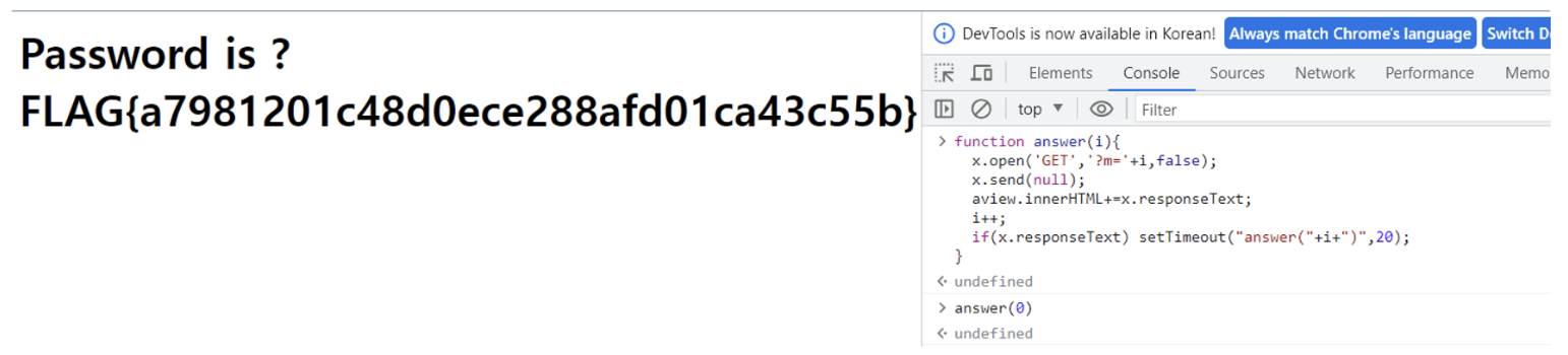 개발자 도구 console창에서 함수 answer을 재정의하고 answer(0)을 추가로 입력하여 초기요청을 하였다. 그랬더니 이전처럼 문자가 나타났다 사라지는 것이 아니라 계속해서 추가되었다. 해당 플래그를 입력하였더니 문제를 풀 수 있었다.