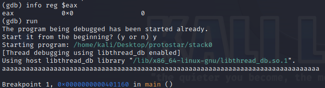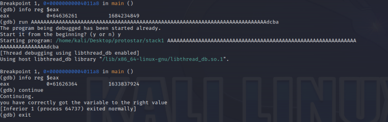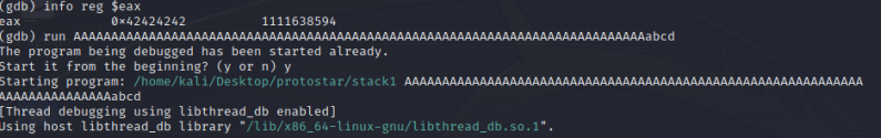 info reg $eax : eax 값을 확인해보면 B로 차있는게 확인됨 > 제대로 덮어씌워지는걸 확인!