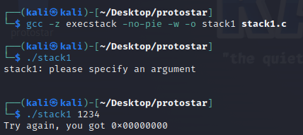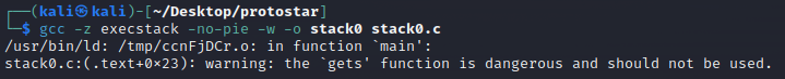 gcc –z execstack –no–pie –w -o stack0 stack0.c : stack0.c라는 C언어 소스 코드 파일을 컴파일하여 ‘stack0’이라는 실행 가능한 바이너리 파일을 생성하며, 실행 스택 보호를 끄고, PIE를 사용하지 않으며, 경고 메시지를 비활성화함.