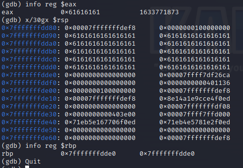 x : 메모리 검사, /30 : 출력할 메모리의 단위 수, g : 8바이트(64비트) 값, x : 16진수 형식, $rsp : 현재 스택의 상단 주소를 가리키며, 스택의 가장 최근에 추가된 데이터를 가리킴