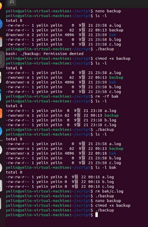 - if! [-d bak]; then: 현재 디렉토리에 bak가 존재하지 않는다면