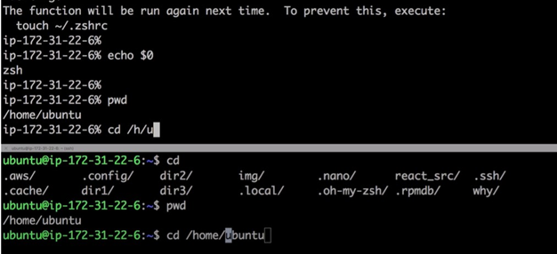 pwd를 누르면 현재 경로를 보여 주는데 zsh에서는 경로의 앞 글자만 쓰고 tab를 누르면 자동완성 시켜준다.
