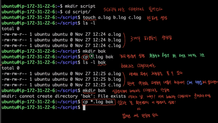 - cp *.log bak: .log 모든 파일을 bak 디렉터리 안으로 복사