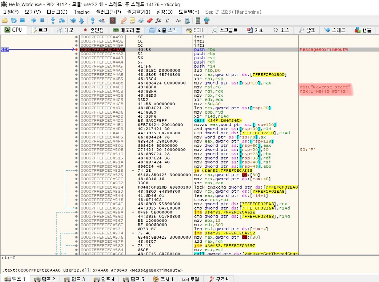 MassageBox를 호출하는 함수나 HelloWorld 문자열을 출력하는 부분을 찾는다.