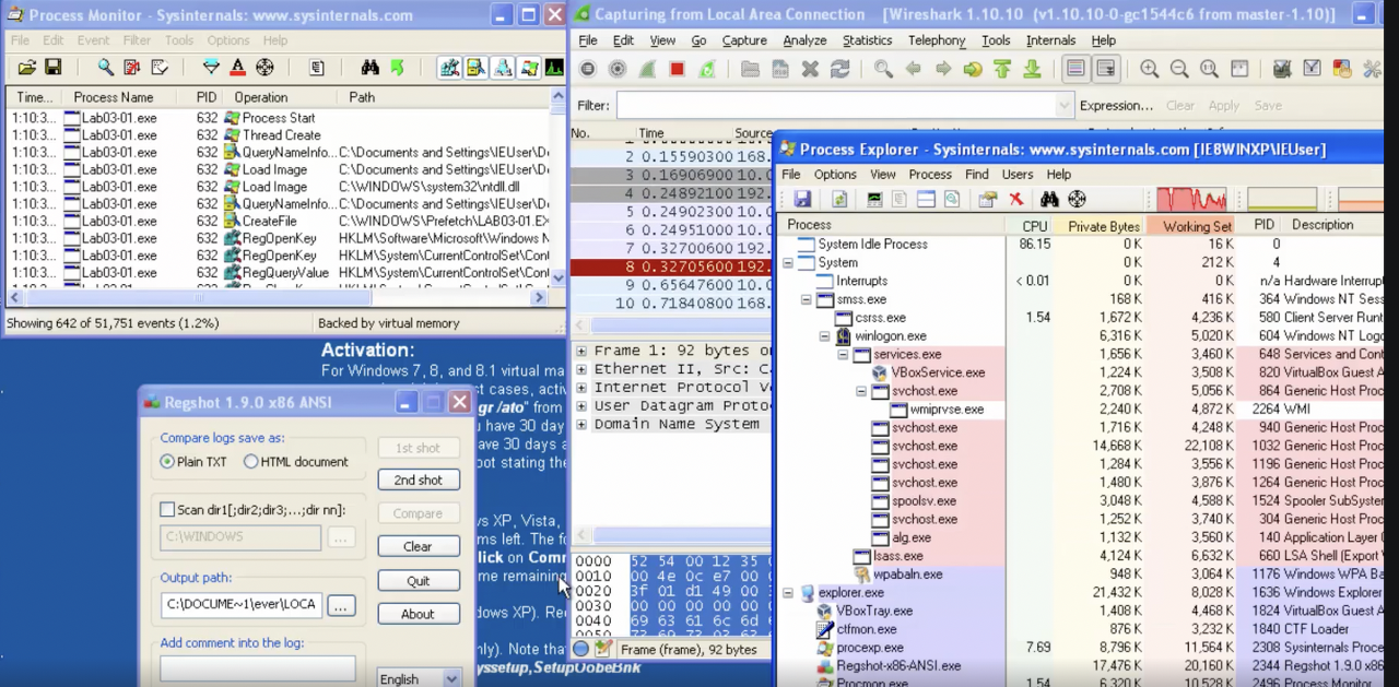 - 레지스트리, 파일시스템, 프로세스. 네트워크 활동을 이해하기 위해 분리된 가상 머신 환경에서 실행하며 분석