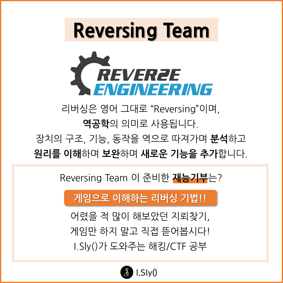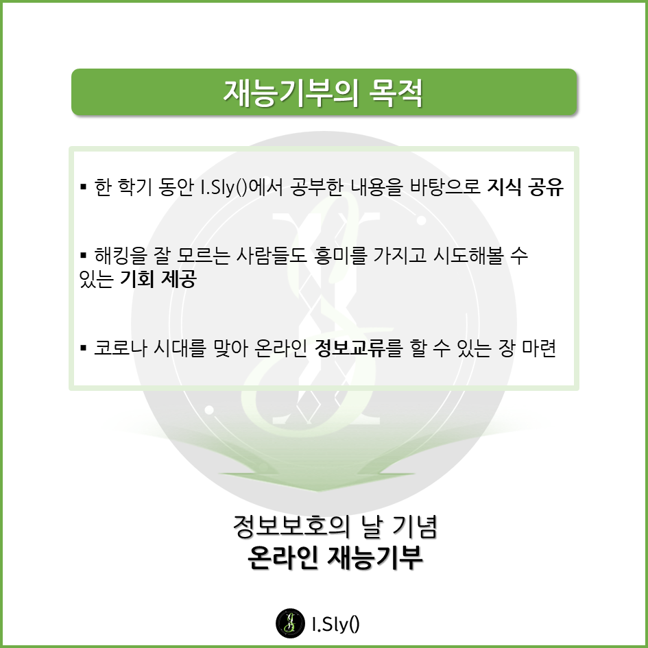 I.Sly()는 웹 해킹, 리버스엔지니어링, 시스템 해킹 등 다양한 해킹 분야에서 기본 소양 및 심화 내용을 공부하며 화이트 해커 양성을 목표로 활동하는 해킹 동아리입니다.