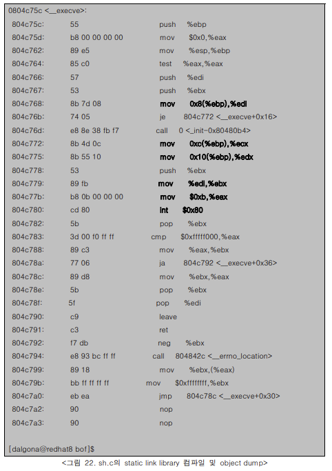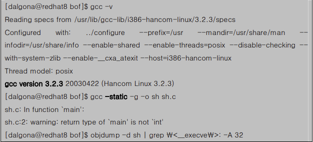 그러면 이제 sh.c 프로그램에서 호출하는 execve() 함수의 내부까지 들여다 보기 위해서 Static Link Library 형태로 컴파일 한 후 기계어 코드를 살펴보자.