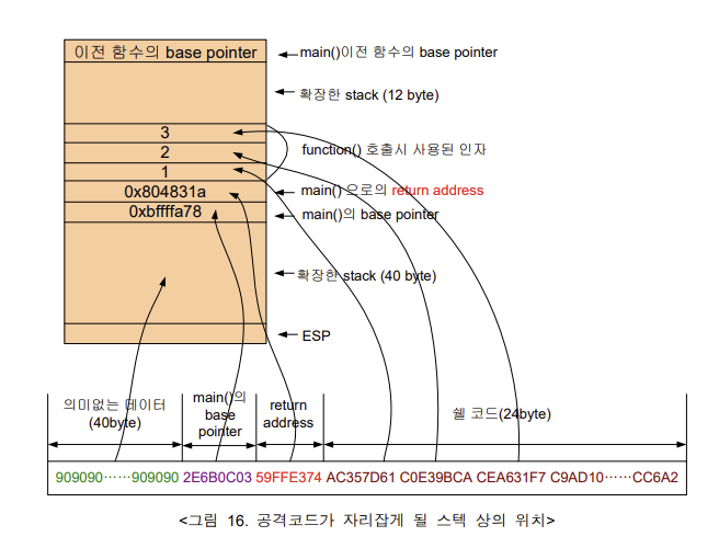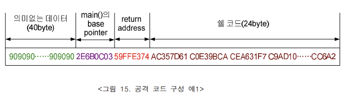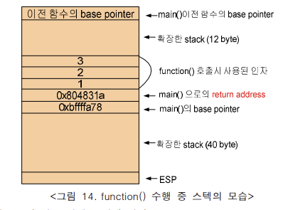 예를 들어 <그림 14>에서 보듯이 스택의 모습은 40바이트의 스택이 준비되어 있으나 40바이트보다 큰 데이터를 쓴다면 아무런 지장이 없을 것이다. 만약 40바이트 이상의 데이터를 쓴다면 이전 함수의 base pointer를 수정하게 될 것이다.
