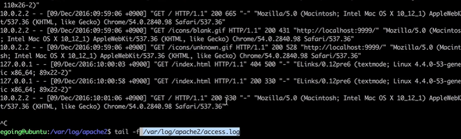 누군가가 웹서버에 접속할 때마다 그 파일의 끝에 접속한 사람의 정보가 추가 되는데 실시간으로 확인하고 싶을 때는 tail 명령어를 써주면 된다.