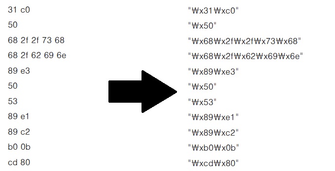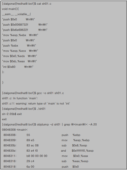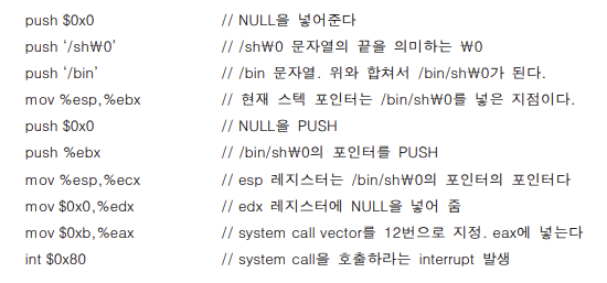여기서 문제점이 발견되었는데, 이렇게 얻은 기계어 쉘 코드를 문자열 형태로 전달할때, push 0x00과 같은 char a[] = "\x6a\x00"형태의 코드들이 0x00 이후의 값이 어떤 값이든 무시하게 되는 것이다. (char형 배열은 0의 값을 만나면 그것을 문자열의 끝으로 인식한다) mov $0xb, %eax 등 0x00과 같은 형태의 기계어 코드는 상당히 많다.