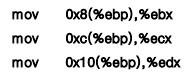 이것은 ebp 레지스터가 가리키는 곳에 +8 바이트 지점의 값을 ebx 레지스터에 넣고, +12바이트 지점의 값을 ecx 레지스터에 넣고, +16바이트 지점의 값을 edx 레지스터에 넣어라는 뜻이다.
