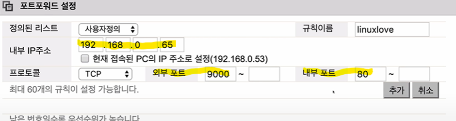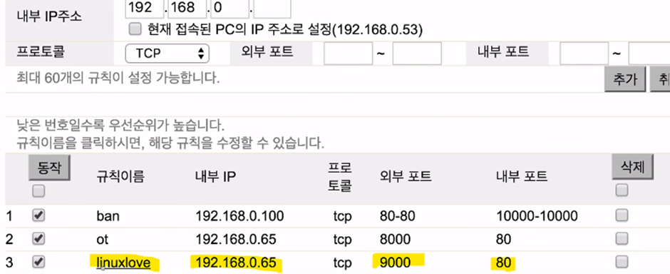 linuxlove라는 규칙에 의해서 9000번 포트로 누군가 들어왔을 때 192.168.0.65에 해당하는 컴퓨터의 80번 포트로 신호를 보낸다라고 규칙을 정해 놓는 것이다.