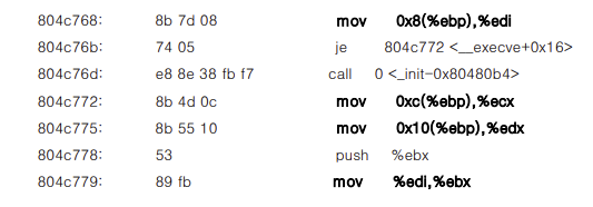 제일 처음 '/bin/sh'라는 문자열이 들어있는곳의 주소(0x8089728)를 ebp 레지스터가 가리키는 곳의 -8 바이트 지점(0xfffffff8)에 넣는다. 그리고 ebp - 4byte 지점(0xffffffc)에는 0을 넣는다. 이것은 sh.c에서