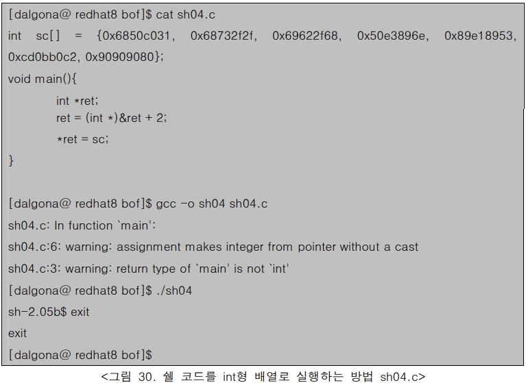 int형으로 만들어진 쉘 코드. 바이너리 데이터를 메모리에 넣고 실행시키는 방법