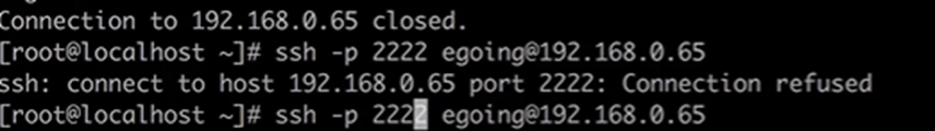 마찬가지로 2222는 거절되고 22는 접속이 된다는 건 SSH라고 하는 방식은 22번 포트를 쓴다는 것을 알 수 있다.