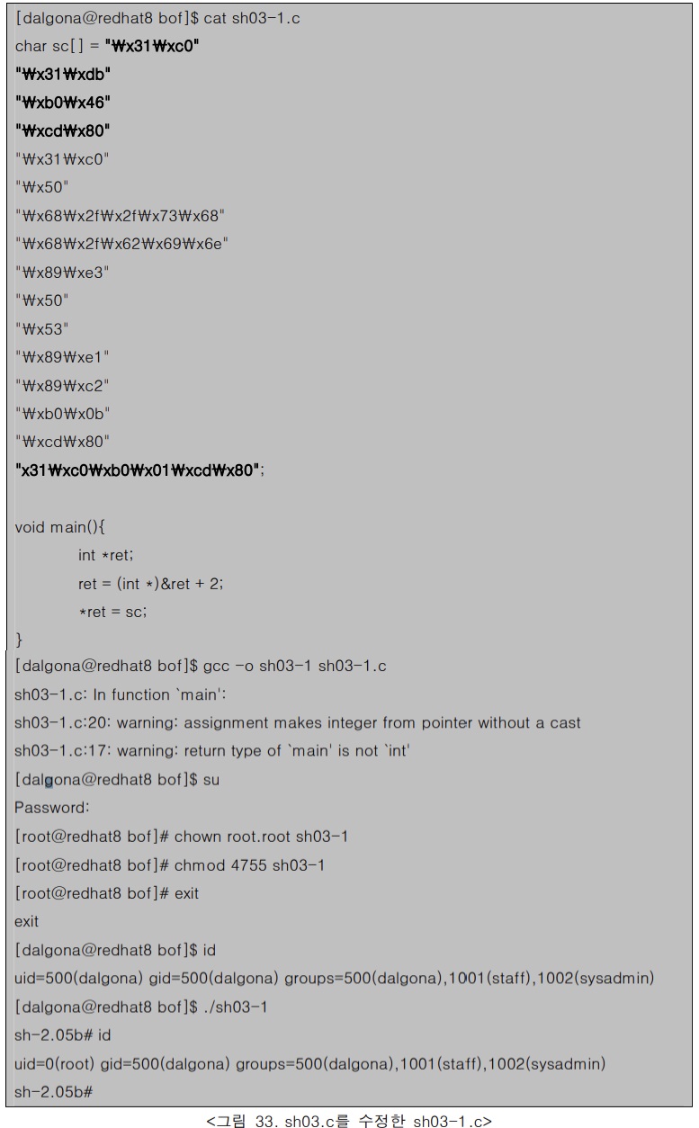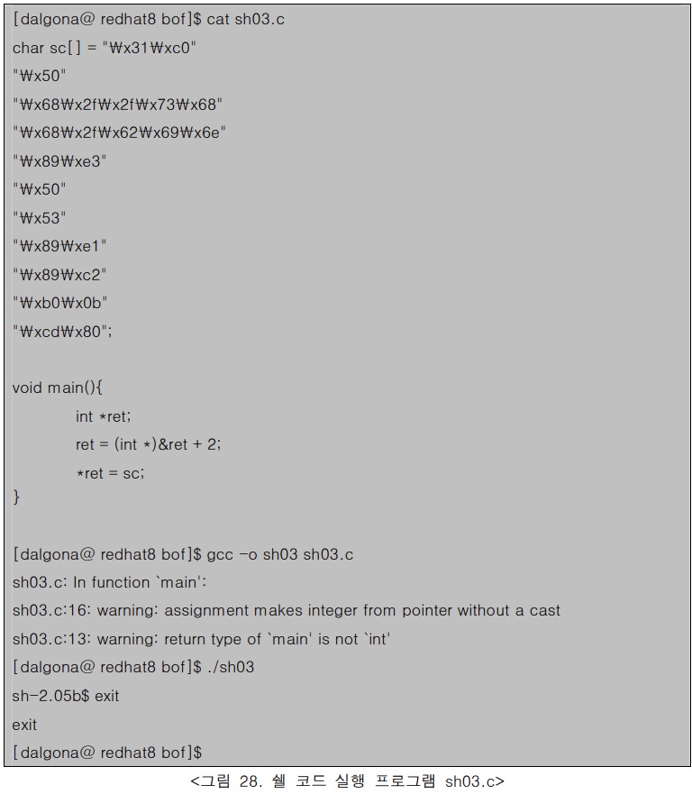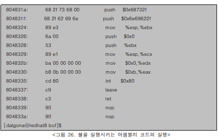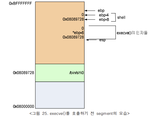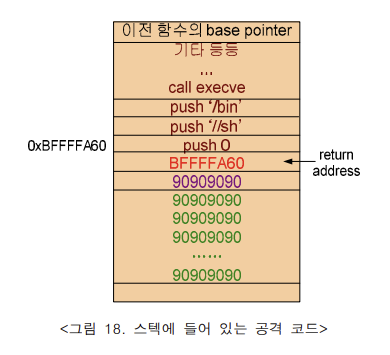 <그림 18> 에서 보여주는 공격코드는 execve("/bin/sh", ...) 이다. 이것이 바로 bufer overflow를 이용한 공격방법이다.