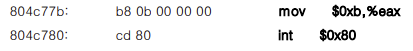 int $0x80을 호출하기 이전에 eax 레지스터에 시스템 콜 벡터를 지정해 줘야 하는데 execve()에 해당하는 값이 11(0xb)인 것이다. 정리해서 다시 말하면 11번 시스템 콜을 호출하기 위해 각 범용 레지스터에 값들을 채우고 시스템 콜을 위한 인터럽트를 발생시킨 것이다.