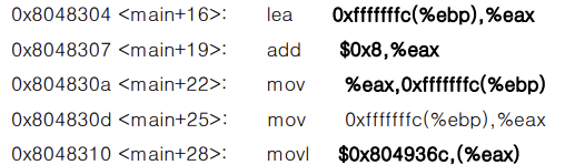 - 먼저 ebp-4byte 지점의 address를 eax 레지스터에 넣는다. 그 다음 그 address에 8을 더한다.