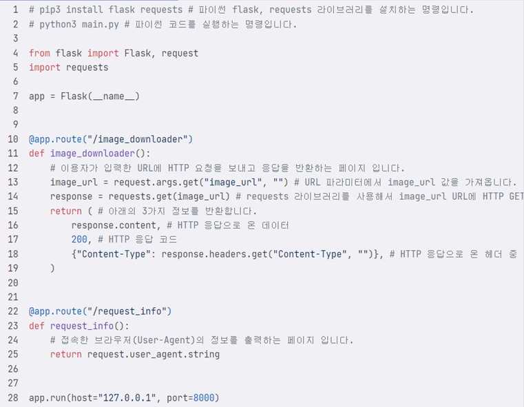 - 위의 코드는 이용자가 전달한 URL에 요청을 보내는 예제 코드이다. 위 경로에 접속하면 image_downloader에서는 http://127.0.0.1:8000/request_info URL에 HTTP 요청을 보내고 응답을 반환한다. 반환한 값을 확인해보면 브라우저로 request_info 엔드포인트에 접속했을 때와 다르게 브라우저 정보가 python-requests/<LIBRARY_VERSION>인 것을 확인할 수 있다.이처럼 이용자가 웹 서비스에서 사용하는 마이크로서비스의 API 주소를 알아내고, image_url에 주소를 전달하면 외부에서 직접 접근할 수 없는 마이크로서비스의 기능을 임의로 사용할 수 있다.