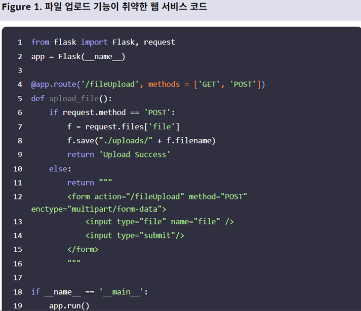 - 위의 코드 중 /fileUpload는 post의 요청을 받으면 클라이언트가 전송한 파일을 ./uploads에 저장한다. f.filename이라는 이용자가 입력한 파일 이름을 그대로 사용하기에 Path Traversal 취약점이 있다.