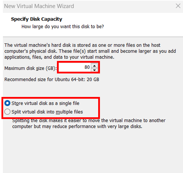 'Store virtual disk as a single file'은 가상머신 디스크 설정을 하나의 파일에 저장하고, 'Split virtual disk into multple files'은 여러 개의 파일로 나누어 저장하겠다는 의미입니다.