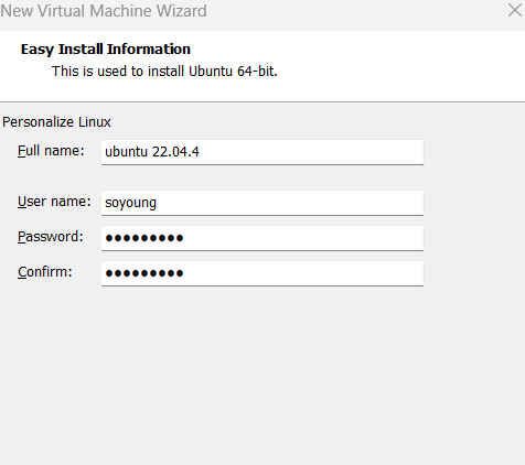 계정 정보를 입력하는 창으로, Full name(가상 머신에 설치되는 우분투 시스템 이름) , User name, password, password confirm(비밀번호 확인)을 입력해주고 Next를 눌러 넘어갑니다.