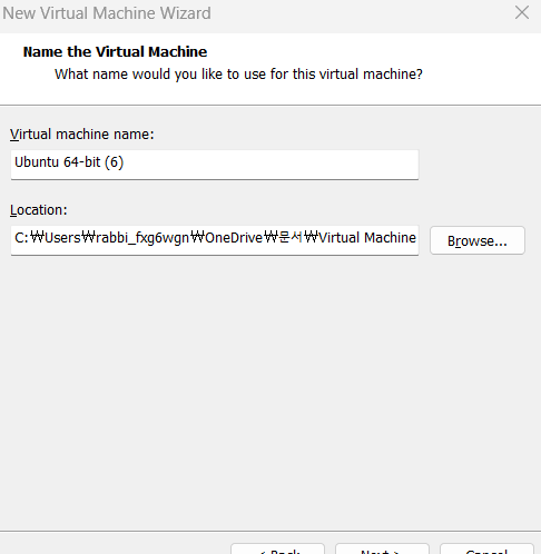 Browse 버튼을 눌러 가상머신을 설치할 위치를 선택한 후 Next 버튼을 눌러 넘어갑니다.