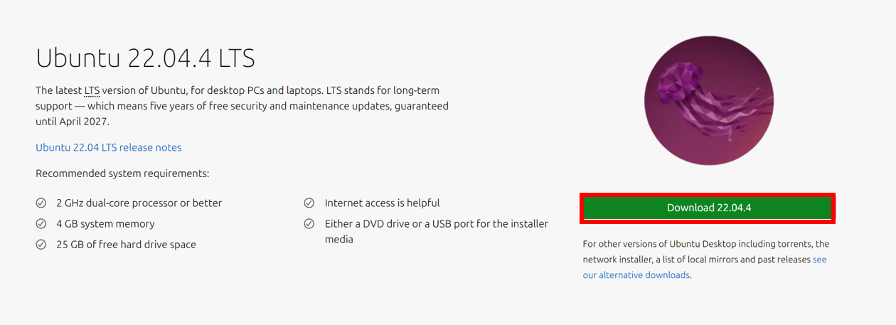 위의 링크를 클릭한 후 'Download 22.04.4'를 눌러 Ubuntu 22.04.4 LTS 버전을 다운로드합니다. 자동으로 이미지 파일(.iso)이 설치되며, 이는 용량이 커서 설치가 오래 걸릴 수 있습니다.