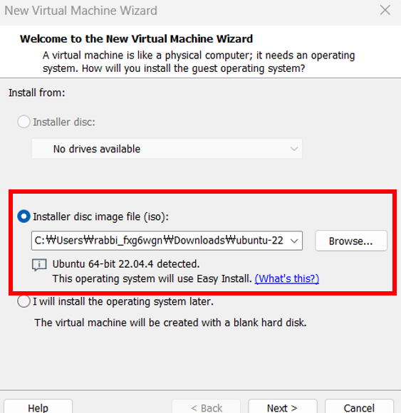 'Installer disk image file (iso)'를 선택하고 Browse 버튼을 눌러 위에서 설치했던 Ubuntu 22.04.4 파일을 선택합니다. Next 버튼을 눌러 다음으로 넘어갑니다.