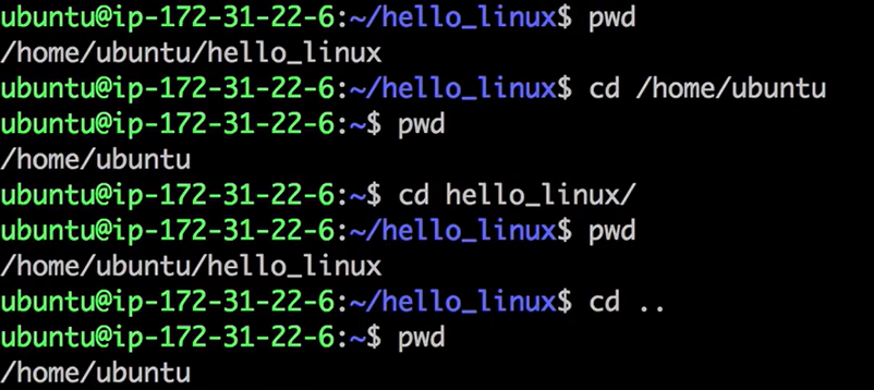 | cd /home(가고자 하는 위치) | - 차상위 디렉토리부터 가고자 하는 곳으로 이동 - 어디에 있는냐에 따라 고정된 디렉토리로 감 - 절대경로 |