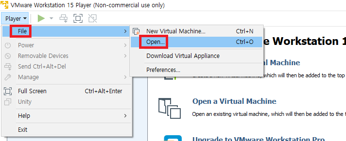 이제 Vmware - File - Open을 해주시면 됩니다.