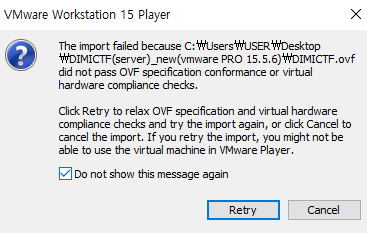1- (제가 했던것처럼) 경로를 다른 곳으로 지정해본다 2- 윈도우 Defense를 꺼본다(윈도우가 동작을 못하게 막는 경우일 수 있음) 3- 자신이 설치한 VMware가 이 ovf파일과 호환이 안되는 경우일 수 있어서, 다른 버전 설치 (그렇지만 VMware 12,15 버전정도면 괜찮을거라고 생각합니다) 4- 컴퓨터 BIOS 모드에 진입하여 vf-x 모드 활성화 (보통 노트북보다 PC의 경우 많이 발생합니다. 컴퓨터가 가상화가 켜져있어야 가상머신 사용이 가능해지는데, 꺼져있는 경우입니다. 컴퓨터 제조사에 따라 바이오스 모드 진입방법이 모두 달라 본인이 직접 구글링 하여 확인하는 것을 추천합니다.) 5- 본인의 OS는 32비트 체제이지만, 가상머신은 64비트인 경우 가상머신을 동일한 체제로 재설치 요망 |