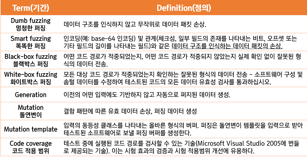 1. 퍼징: 보안 버그 중 가장 심각한 부분을 차지하는 코드에서 결함을 찾아내는 체계적인 방법