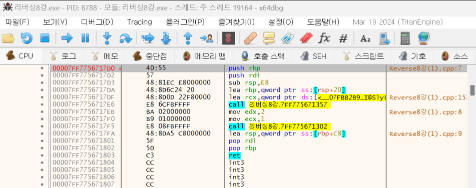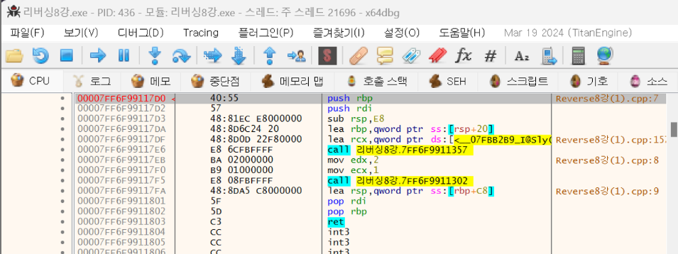 x64dbg에서 main함수 찾는다. 코드를 Cdecl과 다르게 바꿨는데 x64dbg에서 나오는 결과가 같아 강의 내에서 실습이 중단되었다. ( --> 실행 시키지 않고 바로 x64dbg로 확인한 것이 이유이지 않을까? 라고 추측함)