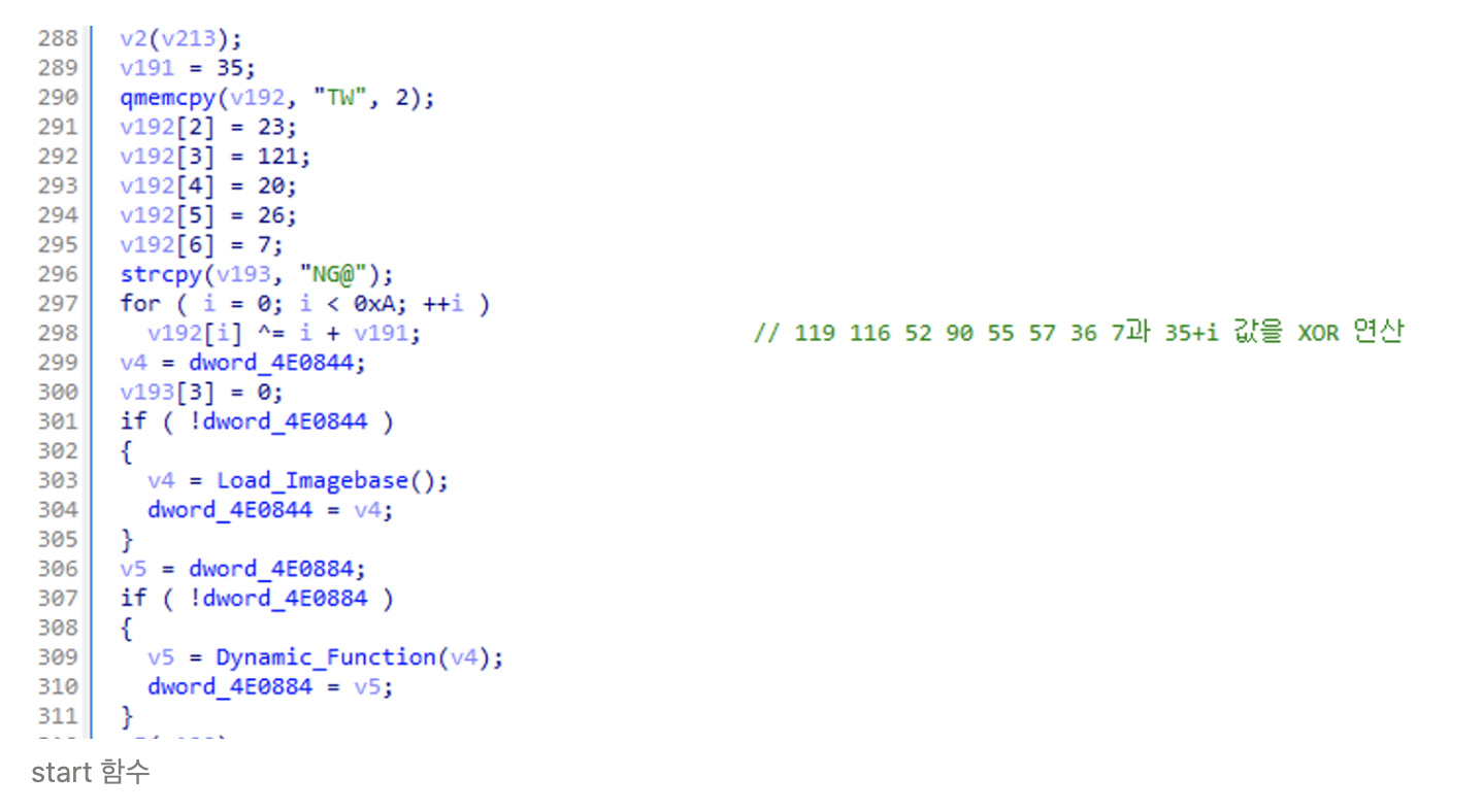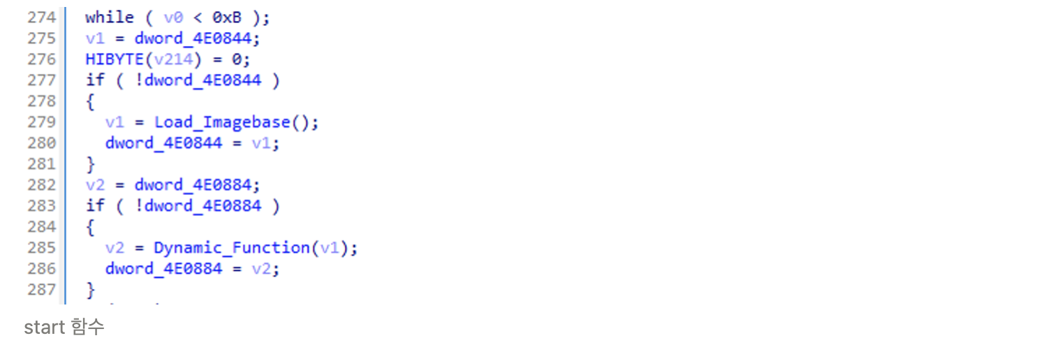 이후 Imagebase와 모듈값을 가져와 동적으로 Import API를 가져오는 것을 확인할 수 있습니다. Dynamic_Funciton은 해시값을 이용하여 API를 가져옵니다.
