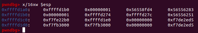 - x/16xw $esp : esp 레지스터를 기준으로 64바이트를 4바이트씩 쪼개어 16진수로 나타내라